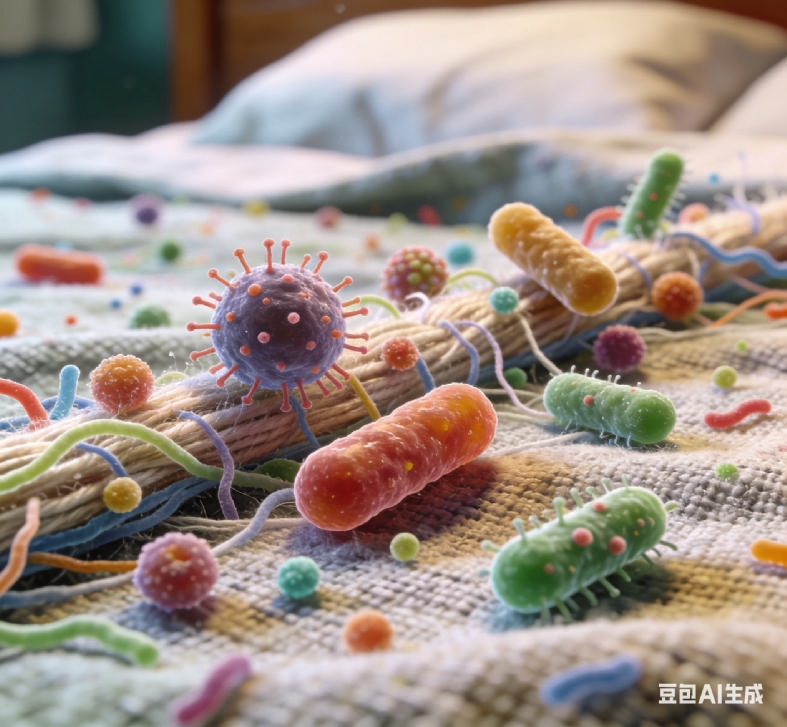 病毒:病毒虽存活时间短,但风险从没饶过谁!感冒飞沫里的病毒、皮肤疱疹病毒等,会借着咳嗽、打喷嚏或皮肤接触,悄悄污染你的床单。