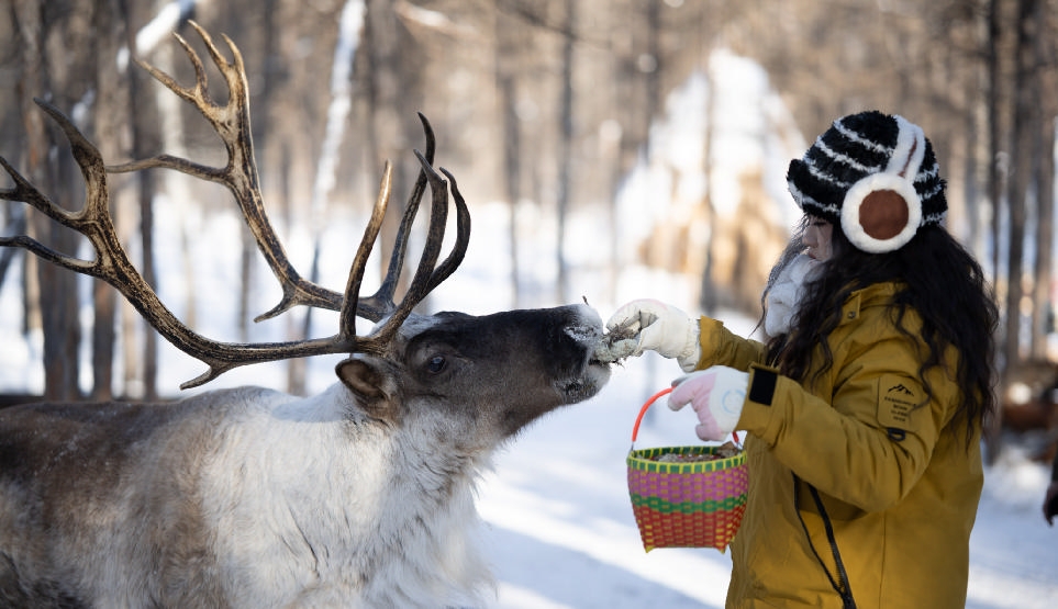 1月15日,游客在根河市敖鲁古雅鄂温克民族乡喂驯鹿。
