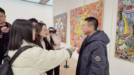 2025年11月,《海上的乡土世界——新时代舟山渔民画艺术作品展》在北京中国美术馆开幕,记者在现场采访