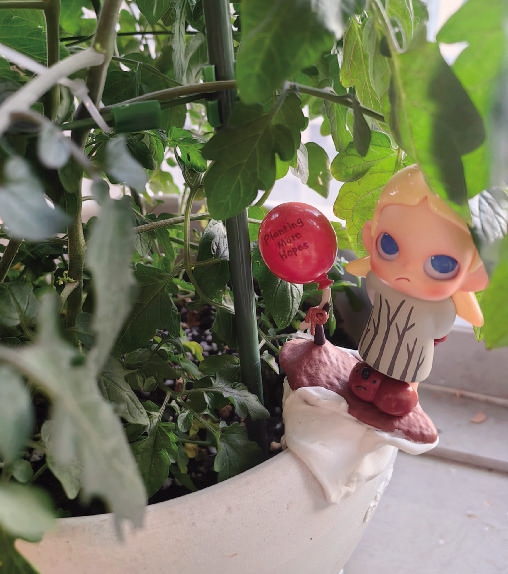 两个月前,她买了一个小小的花架,种了好几盆仙人球,品种多样,小巧可爱。还种了几株小番茄,很有创意地用超轻黏土粘了一个盲盒手办在花盆边缘,“这款手办是我特意选的,名字是‘种下希望’,寄托了我对这些小番茄能成功结果的希望,也希望我自己的工作和生活能天天充满希望吧。”