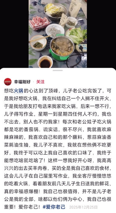 令人动容的是,这一理念不仅限于年轻人。一位网友近日分享了一张截图,称“爱你老己”这个梗的产生就是仿佛为了等这一刻。图片上是一位网名为“幸福刚好”的网友,她在社交媒体上分享了一个再普通不过的生活片段:儿子和丈夫吃完了饭,但她突然很想吃火锅。想起平日爷俩只吃番茄锅,可她爱吃麻辣的,以往都是她妥协,但今天她终于可以吃自己爱吃的口味了。于是这位网友高高兴兴地出门买了自己爱吃的食材,坐在客厅慢悠悠地煮火锅品尝,这一刻所有的选择都是为了自己,而不是以孩子和丈夫为中心。