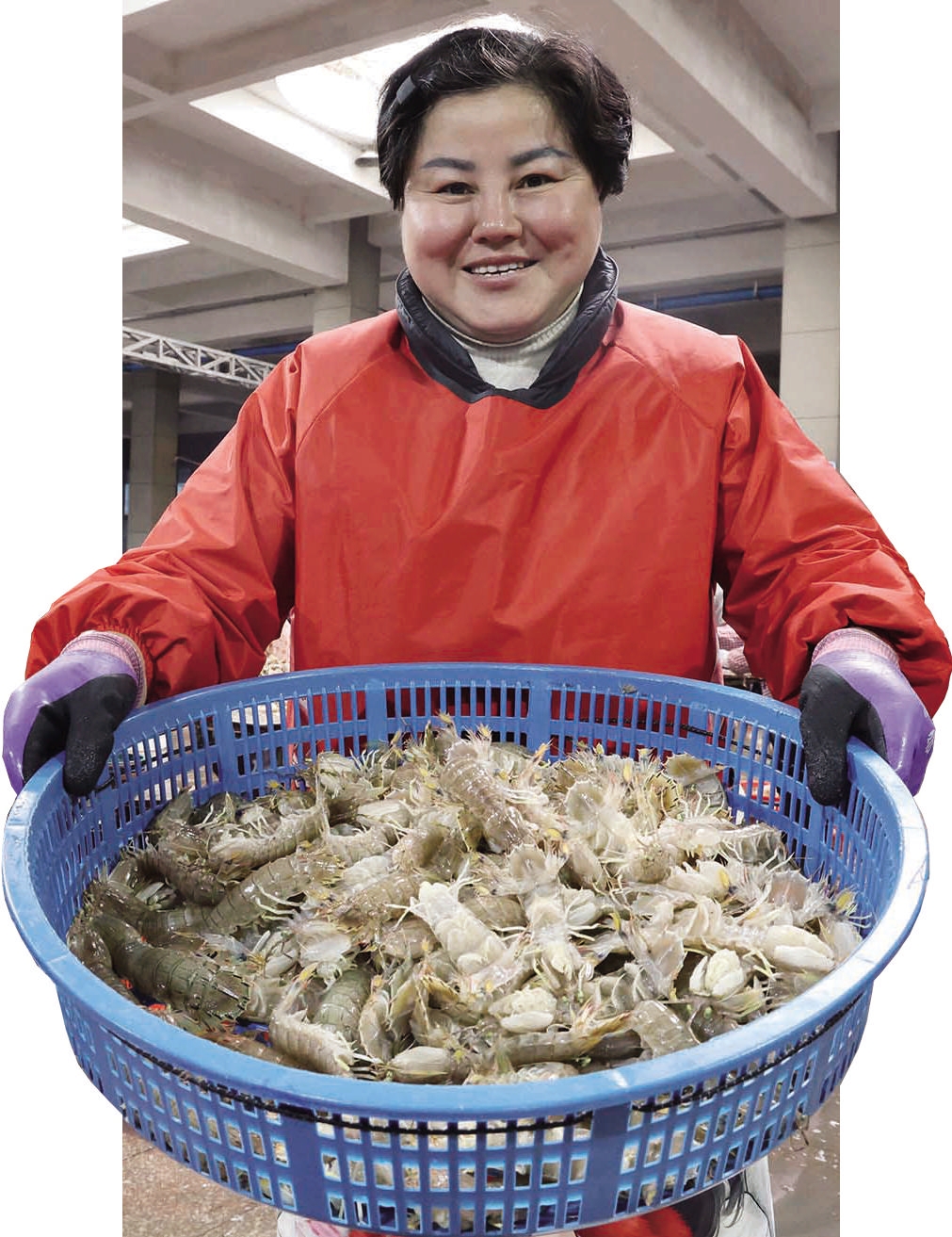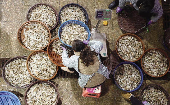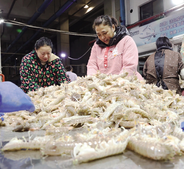 日前,在舟山国际水产城,百余名工人正在对刚运上岸的皮皮虾进行分拣、过秤并打包,现场呈现一片繁忙的景象。据水产城内一商户介绍,时下正是皮皮虾旺发季节,每日他的皮皮虾销量在1万至2万公斤,每公斤售价80元,供应市内外市场,产销两旺。
