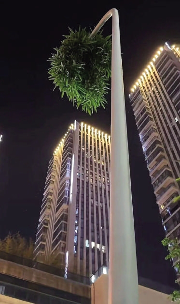 穿透路灯杆,长得枝繁叶茂,引众人打卡拍照