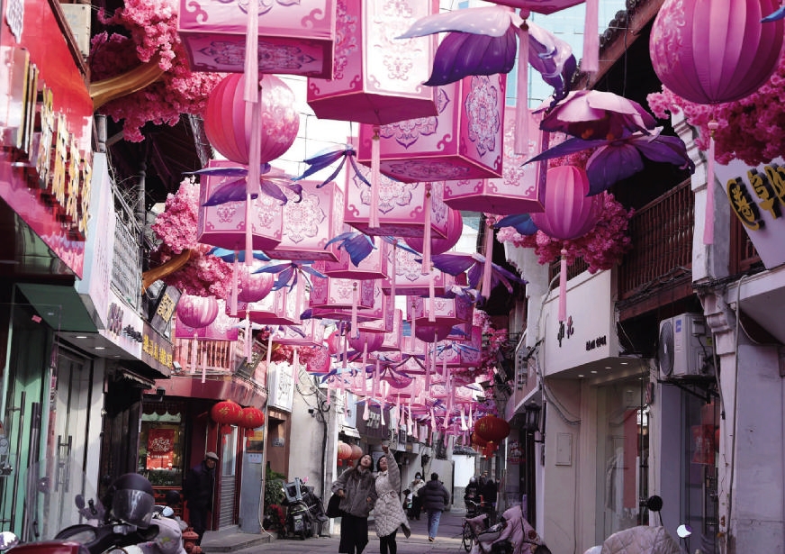 昨天,定海古城西大街及中大街沿线,挂满了各式的彩灯和灯笼,为古街增添了浓浓的喜庆氛围。