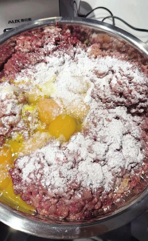 贝贝在做猫饭,把肉搅碎打入鸡蛋,加入营养素