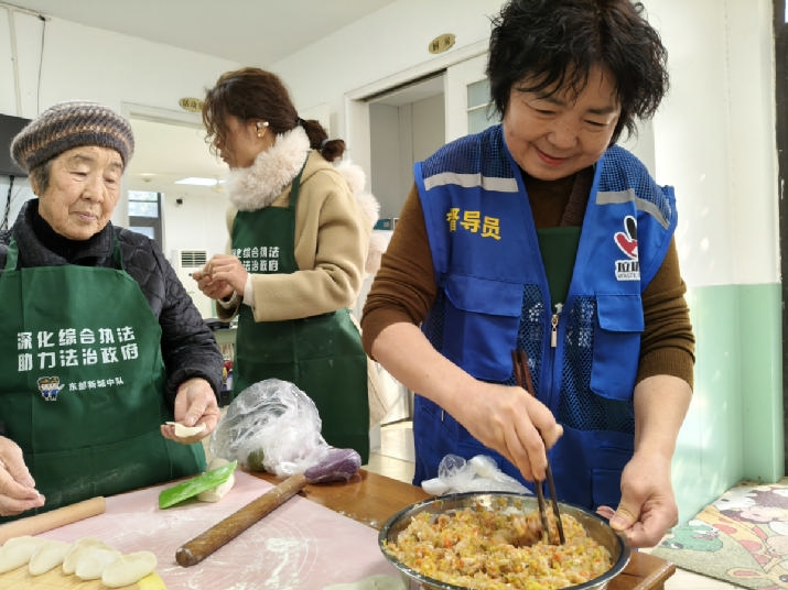 刚退休的女儿主动加入进来,守在贺奶奶身边,像哄小孩一样帮着递皮、添馅。“妈开心,我就陪着她。”社区组织了10名热心居民、网格员、党员志愿者,大家围在一起,组成了临时的“饺子天团”。