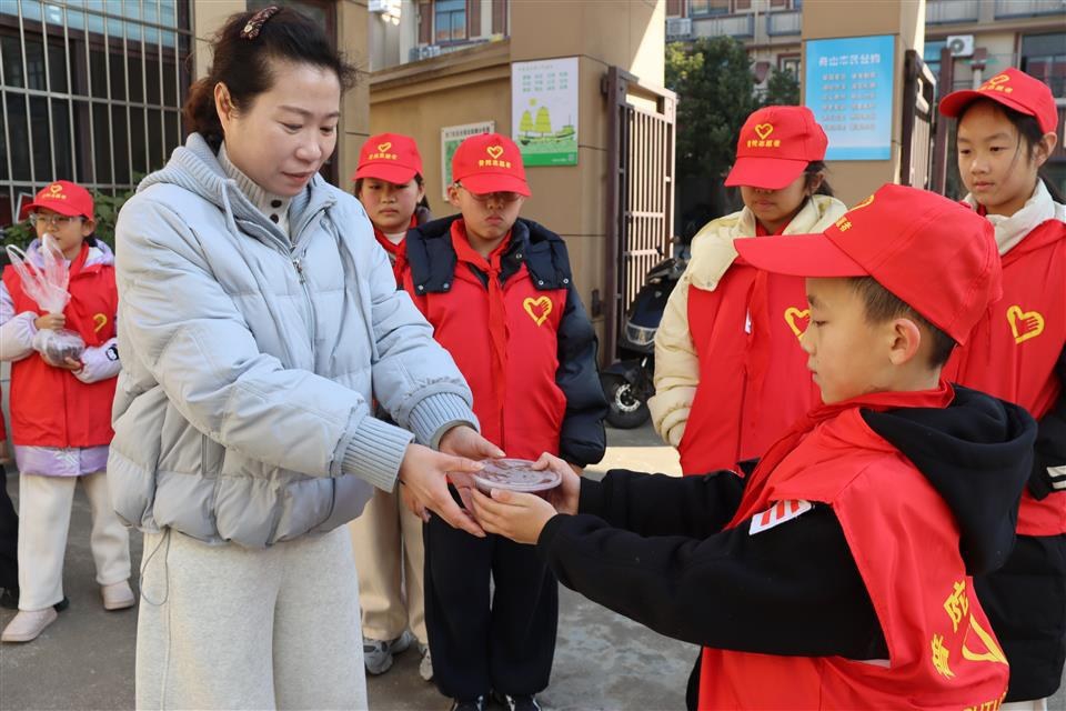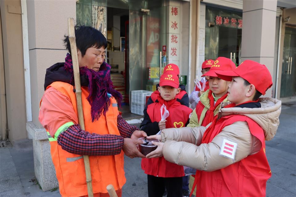 1月23日,普陀区六横镇台门学校的少先队员化身小小志愿者,走上街头为残疾老人、一线工作者送上腊八粥 通讯员 刘生国 曹佳敏 摄