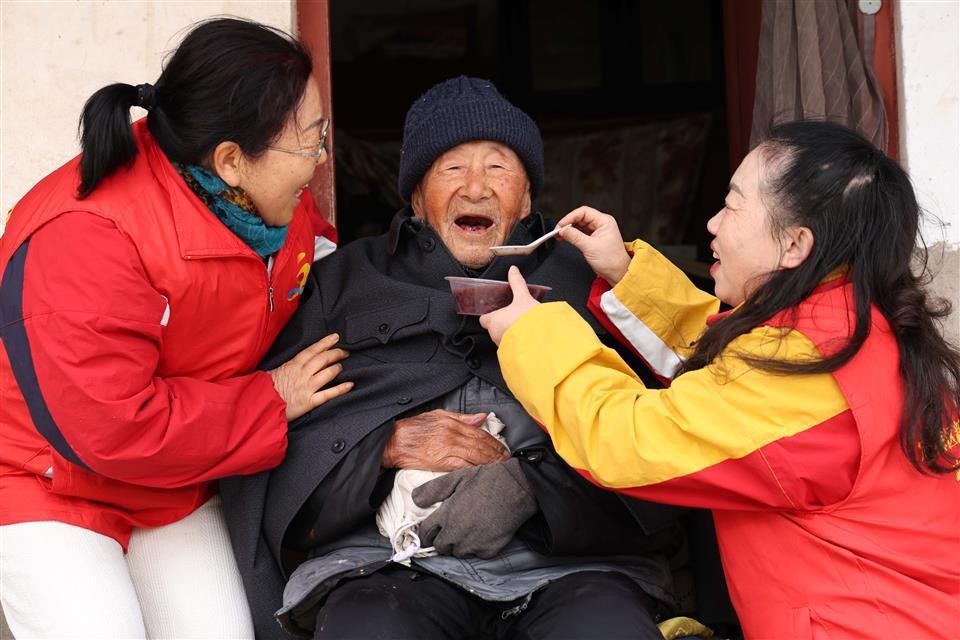 1月25日,定海区美之声演唱团志愿者带着腊八粥,前往摘箬山岛、刺山岛等偏远小岛,为岛上104岁的王阿狗老人,以及傅小娘、王良乾等多位老人送上热粥与节日祝福 记者 陈永建 摄