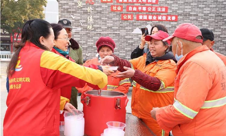 1月25日,定海区城东街道幸福食堂爱心驿站开展冬日“暖心行动”,志愿者为环卫工人送上腊八粥 记者 陈永建 摄