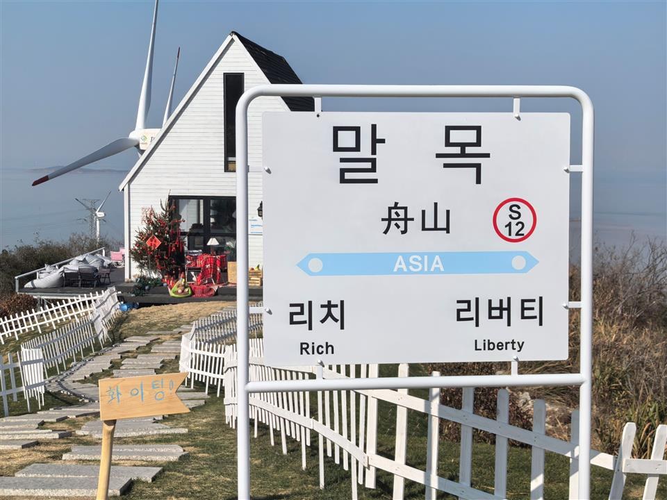 在定海马目风车营地一家咖啡屋外看到,这块独立放置的钢质标识牌上,韩文“말목”字体最大,中间的汉字“舟山”字号明显偏小,下方还配英文“ASIA”(亚洲)及“리치”“리버티”“Rich”(富有)“Liberty”(自由)等韩英文字样。