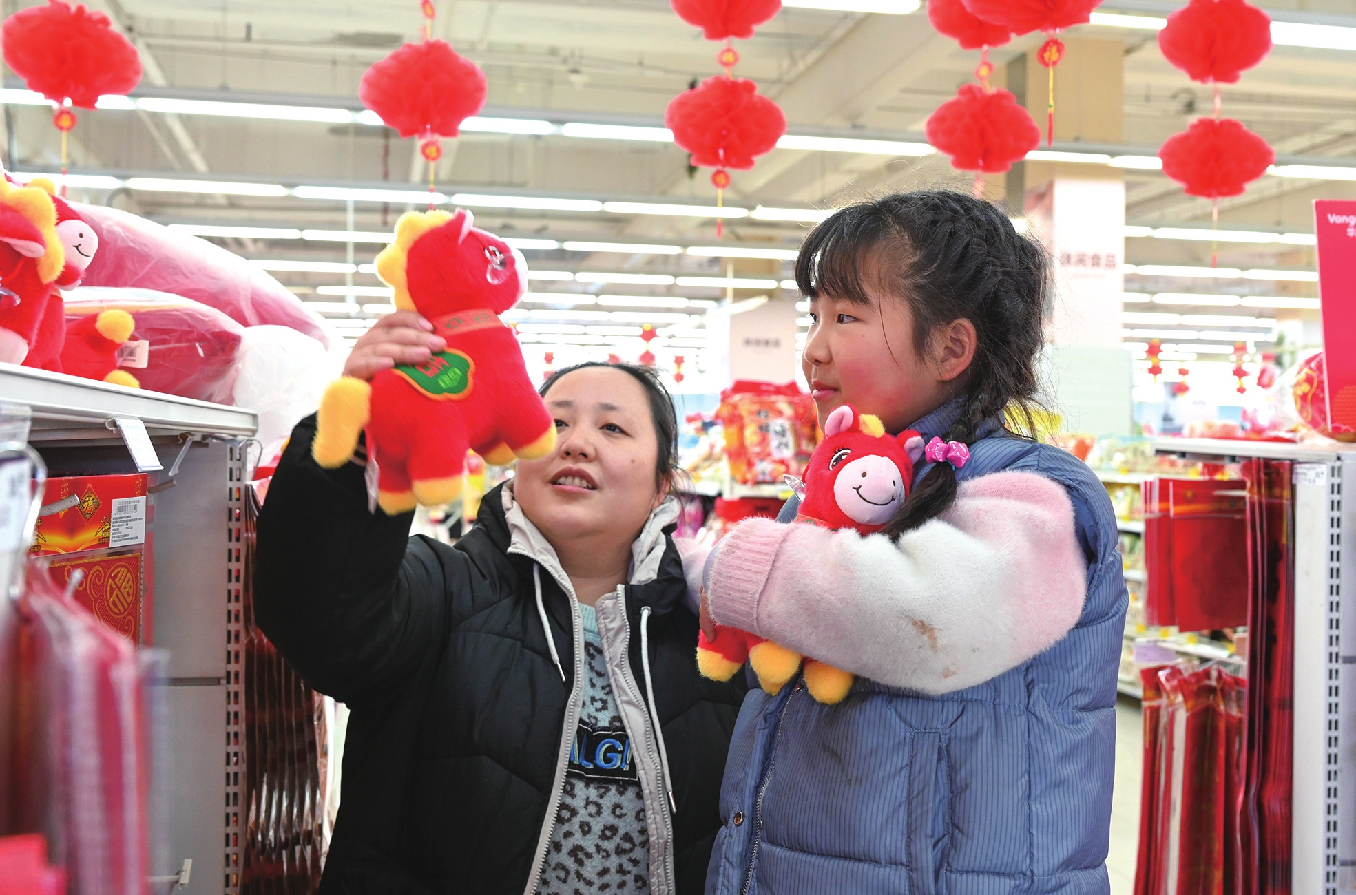 1月27日,在我市一家商超内,浓浓的年味扑面而来,红彤彤的灯笼挂满了天花板,一对母女正在热闹的年货区挑选马年毛绒玩偶。小女孩怀里紧紧抱着一个玩偶,亮晶晶的眼睛盯着货架上另一只,拉着妈妈的手笑着说“好事成双”。随着马年春节的脚步越来越近,这些憨态可掬、寓意吉祥的马年毛绒玩偶,成为了市民传递祝福、增添年味的心头好。 记者 沈磊 摄