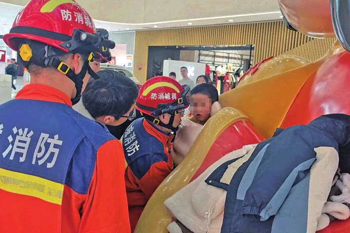1月25日下午4时许,义乌一大型商业综合体内发生惊险一幕:一名男童在玩耍时,头部不慎卡入商场财神雕塑双手之间的空隙中,无法脱身。商场安保人员尝试多种方法未果,随即报警求助。