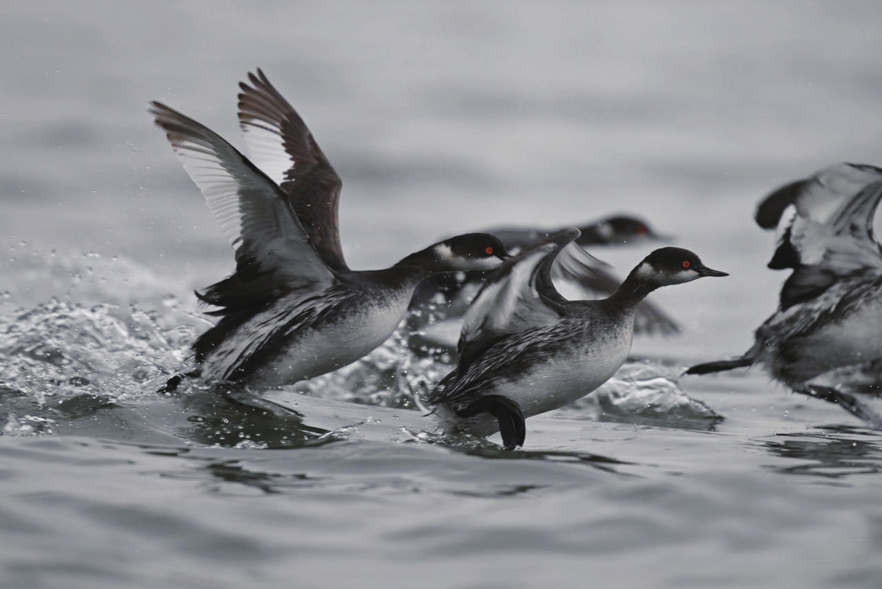 据浙江省野生动植物保护协会野鸟分会副理事长、资深护鸟人程国龙介绍,黑颈鸊鷉是鸊鷉科中型水鸟,通体灰褐,冬羽时眼后具醒目浅色斑纹,性情机警,善潜水捕食小鱼、蛙类、蝌蚪及水生甲壳类,对水质和生态环境要求极高。