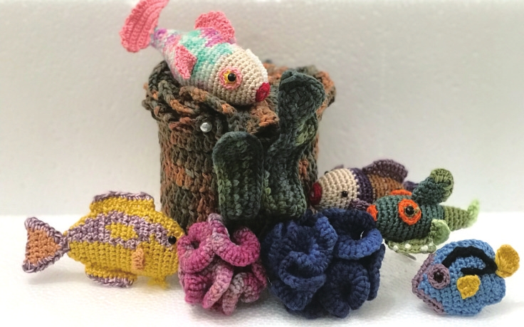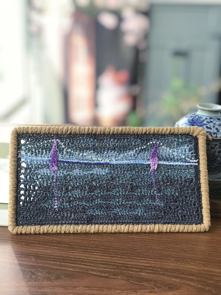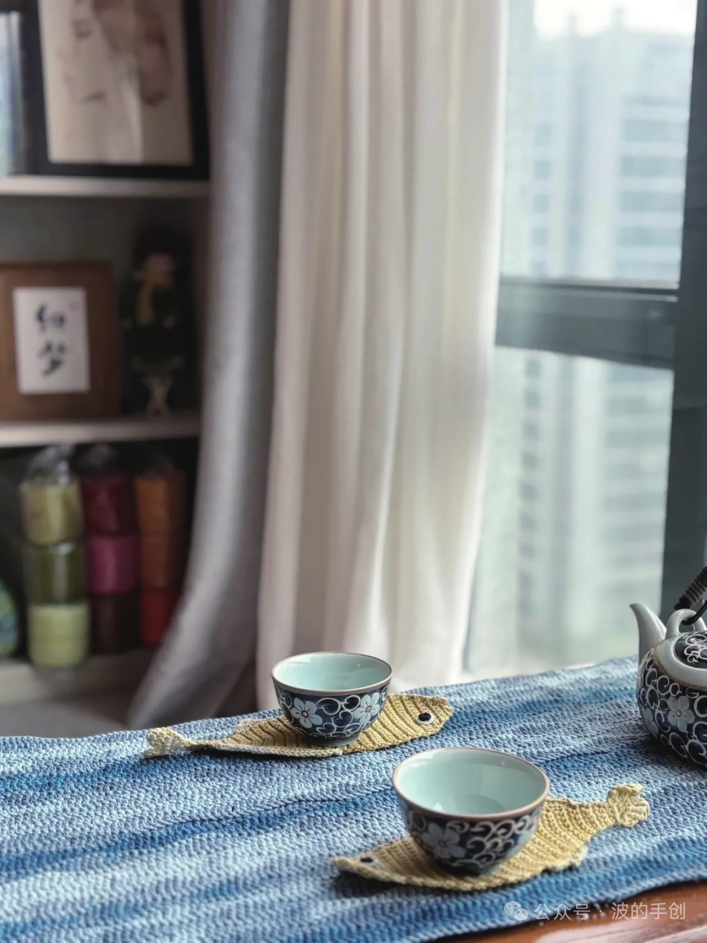 在董波的工作台上,一条“大黄鱼”正安静地躺在蓝色的钩织茶席上。这不是一条真鱼,而是她用钩针和毛线精心编织的杯垫。最近,这样的“大黄鱼杯垫”成了她的新宠,主客饮茶时各置一条于杯下,一方小小的茶席瞬间充盈着海洋的咸鲜气息。不远处,还摆放着一件她的得意之作——白沙岛海钓者雕塑的钩织版本,垂钓者的姿态、海水的波纹,甚至夕阳的余晖,都被她用不同颜色的毛线凝固在了方寸之间。