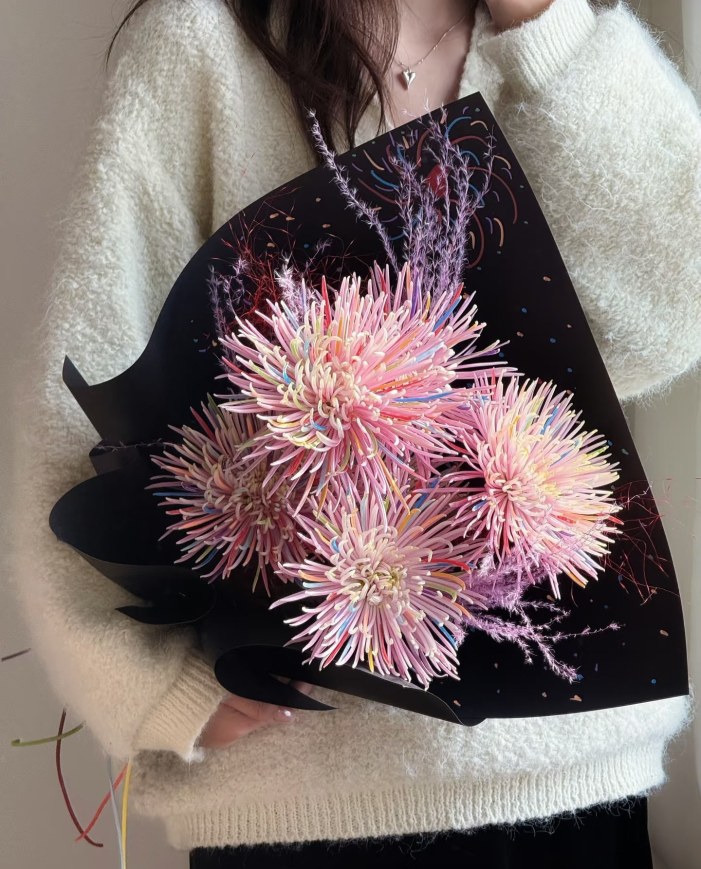 “烟花菊是今年元旦开始火起来的一款,特别是粉色烟花菊。”葛女士向记者展示了一枝花瓣细长、呈管状散开的菊花,“它的花瓣像烟花炸开的轨迹,所以叫烟花菊。今年火起来的是手工上色的版本——用丙烯马克笔,把粉色烟花菊的部分花瓣涂上蓝色、金色或者画出渐变,看起来就更像绽放的烟花了。”