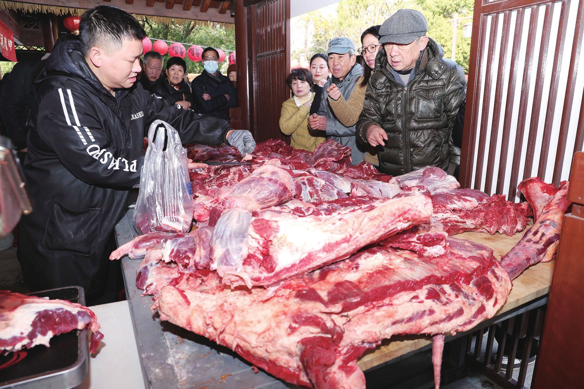 尽管价格不菲,现场市民的购买热情却十分高涨。从定海特地赶来的王先生和刘女士一家,购买了牛腱子、吊龙和牛腩等多种部位,花费400多元。“现杀的黄牛肉新鲜,又是本地牛,买点回去过年给孩子尝尝鲜。”王先生表示。70多岁的马岙村民安老伯也前来选购腿肉,想要品味这份“本土珍宝”的滋味。