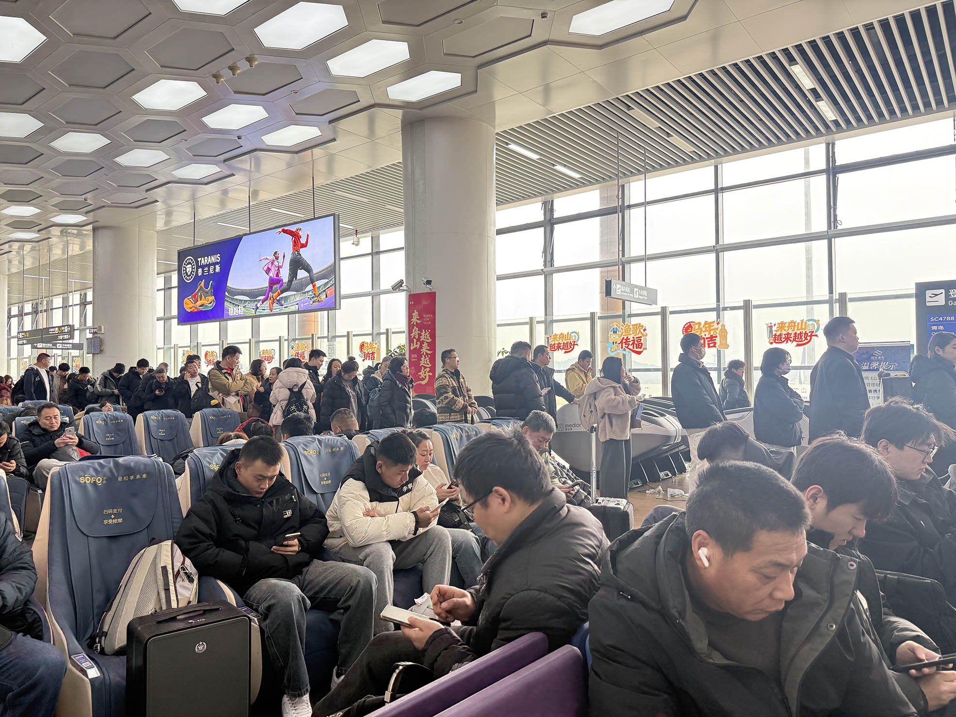 候机大厅内,旅客们带着大包小包,脸上洋溢着回家的喜悦。