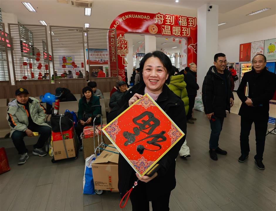 墨香承载祝福,也熨帖年味。中国书法家协会会员周永祥先生早早来到现场,被求墨宝的旅客围拢。红纸铺展,金墨挥洒,一个个饱满大气的“福”字在笔下诞生。在舟山务工的张师傅接过墨迹未干的“福”字,笑得舒展:“今年在舟山干得不错,满载而归!”他悉心卷好字幅收进背包,转身汇入春运人流。