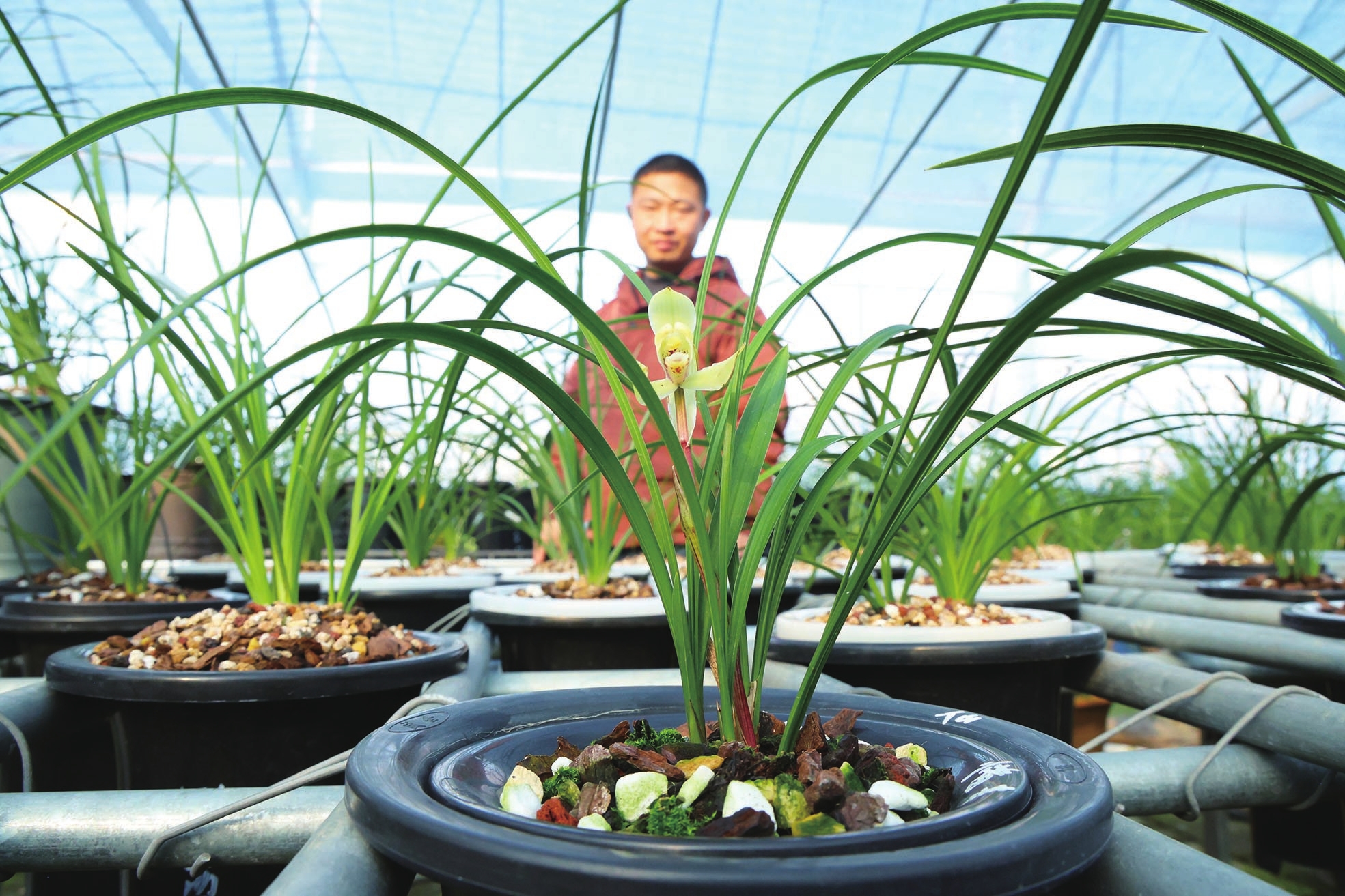 立春今天到来,2月3日,临城街道毛竹山村,种植户熊怀林的兰花大棚内的千余盆兰花亭亭玉立,惜春、翠盖荷等春兰品种迎来美丽绽放,呈现一派生机勃勃的景象。据他介绍,他种植的兰花有俞氏素荷、汪小尚、金色阳春等50余种,其中春兰品种十余种,主要通过线上销售,市场价每株在50元至500元不等。