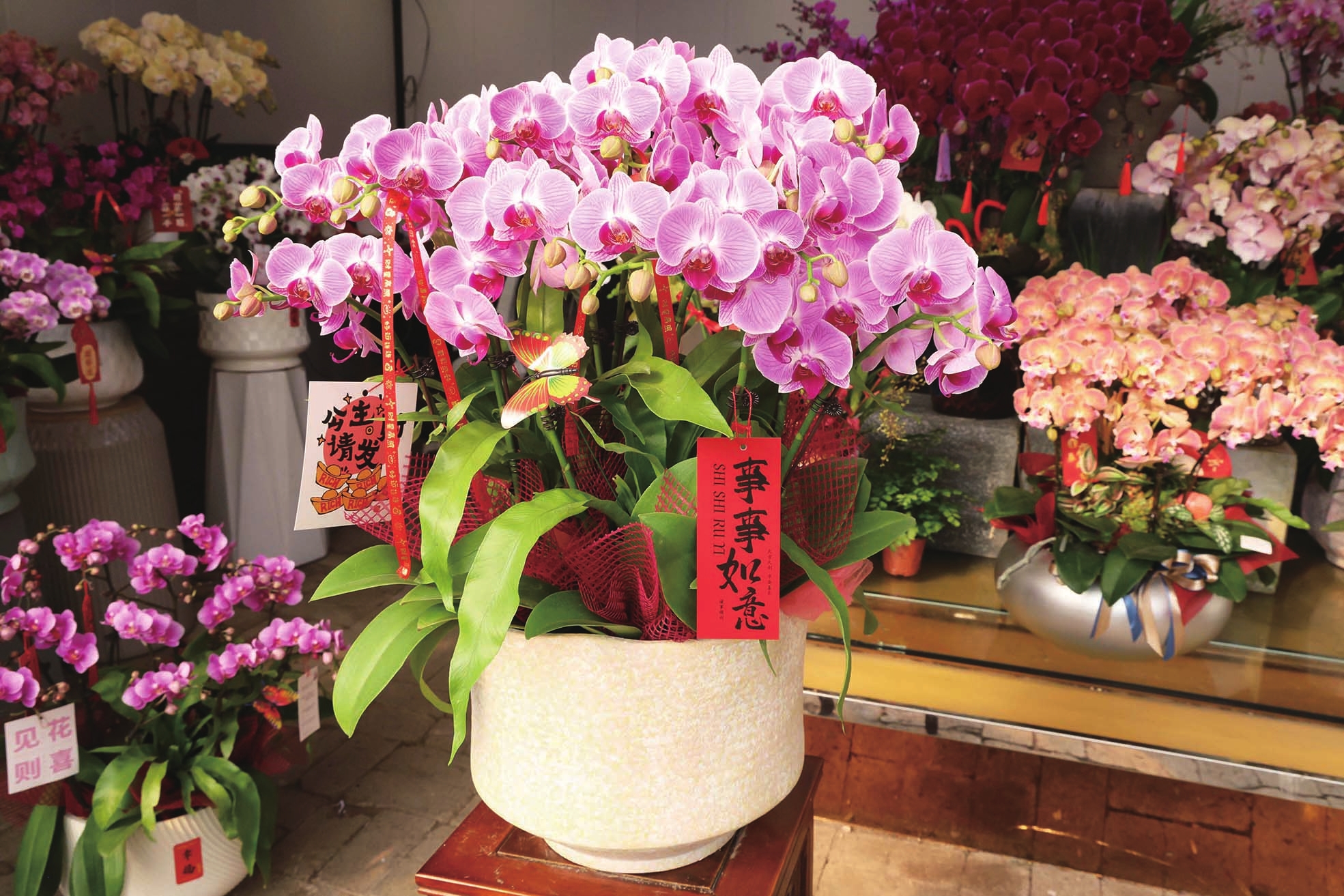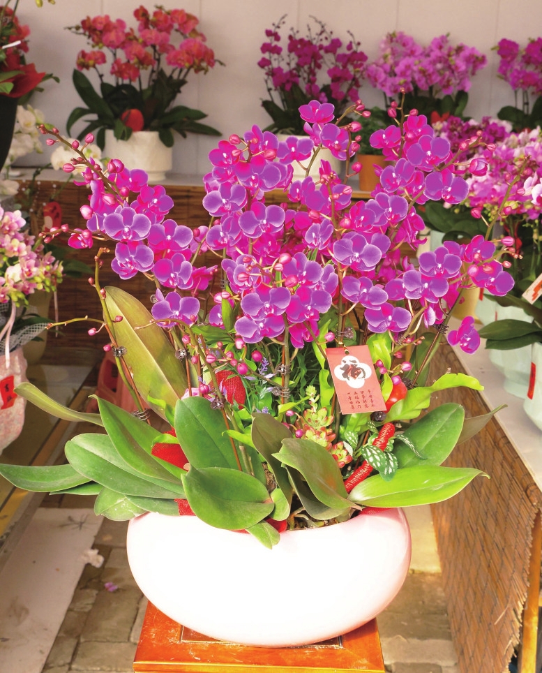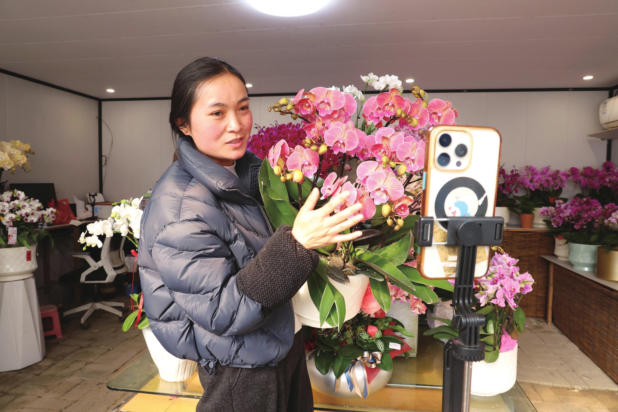 2月3日,在临城街道小屿林植艺园,种植户陈丹正通过线上直播销售年宵花。据她介绍,她的大棚内现有蝴蝶兰、北美冬青、黄金万两、四季橘等百余盆年宵花卉,销售价格从每盆100元到1000元不等,十分畅销。 记者 陈永建 摄
