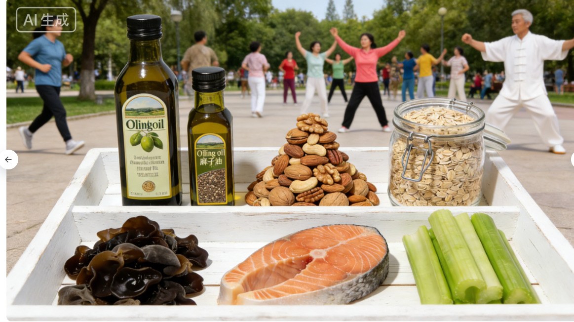 吃得对,减少“坏脂肪”。多补“好营养”。日常减少动物内脏、油炸食品、奶油蛋糕的摄入,用橄榄油、亚麻籽油代替普通食用油;每周吃2次深海鱼,比如三文鱼、鳕鱼,每天吃一把坚果,多吃燕麦、芹菜、木耳等食物,它们的Ome-ga-3和膳食纤维能帮助代谢“坏胆固醇”。