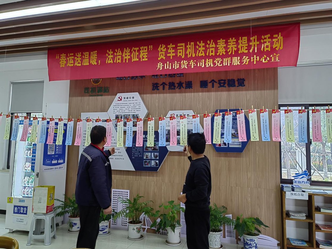 本报讯 随着2026年春运大幕拉开,舟山市交通运输行政执法队在烟墩“司机之家”组织开展了“春运送温暖,法治伴征程”货车司机法治素养提升活动,为奔波在春运途中的货车司机送去一份暖心的关怀与实用的法律知识。