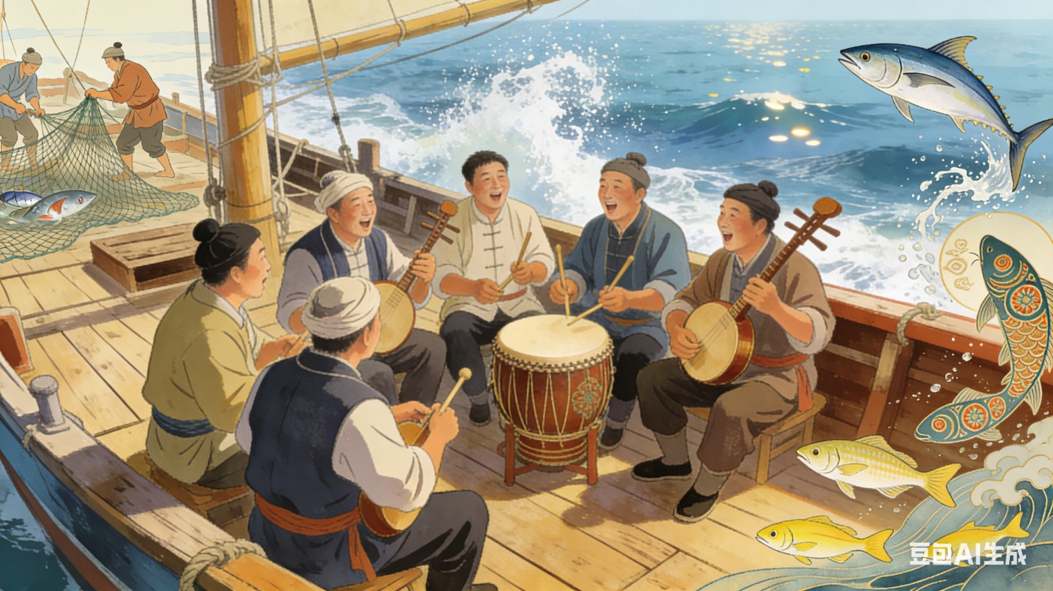 如“吔啰吼,阿家啰,吔来嗨,阿家来,吔来嗨,阿作来,吔啰吼,阿吆啦,阿作来,摇橹嗨,摇橹嗨,啊哟来”,这是一段摇橹号子,这种三音一顿的句式巧妙地配合了摇橹的节奏,使得艰苦的劳作与音顿节奏和谐完美的交融,把大家的力量很好地调动起来。他们在大海中,吃着透骨新鲜锃亮的海鲜,唱着铿锵有力的渔民号子,诉说着自己对这片海洋的爱,对美好生活的追求和向往。听到这些歌声,你会真正体味到渔民性格的豪爽。