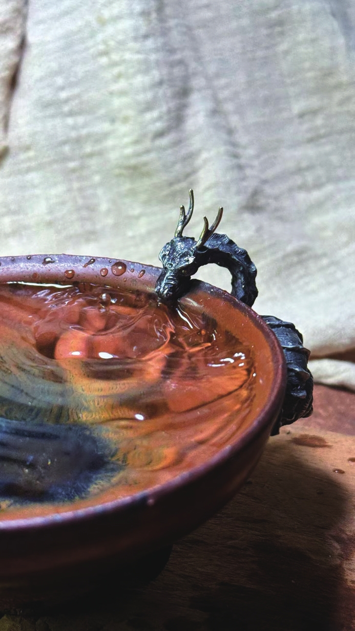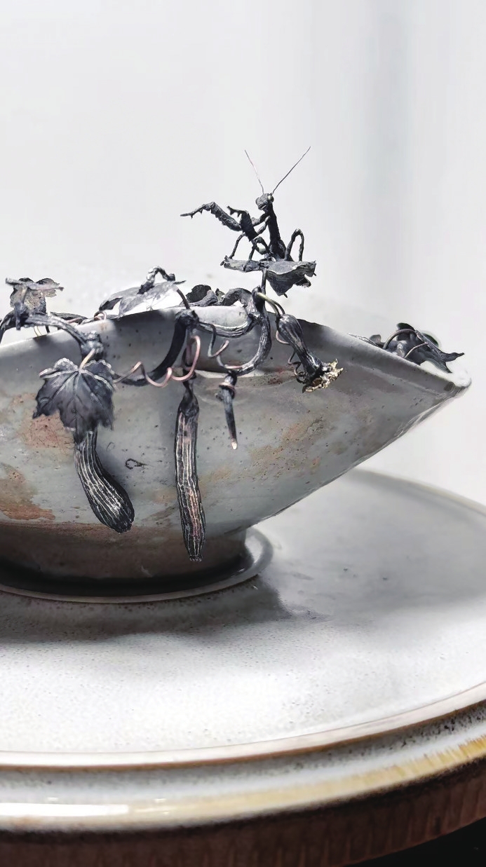 “锡雕需要一些巧思。”董超凭借自己的美术功底,根据建盏残片的造型、纹理设计独一无二的修复方案。例如一件宋代建盏残片,他没有用锔钉将碎片拼接,而是在裂痕处,用锡雕嵌入带有战国器物元素的补丁;遇到建盏里的窑粘,他干脆在碗底雕上一片蜷缩树叶、一只正在向上攀爬的青蛙,将窑粘刻画成树叶上的水珠。他的修复理念是:让破损的瓷器,以一种新的姿态,重新走进人们的视野,兼具实用性与观赏性。