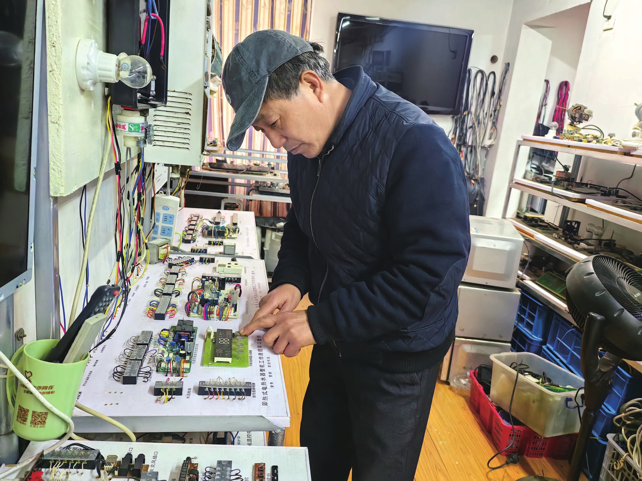 针对基础薄弱的学员,教学往往从最简单的电器开始,比如一台三个档位的电风扇。“从简单入手,学员们一看就懂,容易建立信心。”夏志祥说,通过原理装置和套件的直观展示,配合投影讲解,原本一次只能教六七个人的内容,现在可以同时让三十多人看清看懂。“学员脑子里先有了基本概念和印象,再去接触实物拆装,就容易多了。我只需稍微点拨一下即可。”