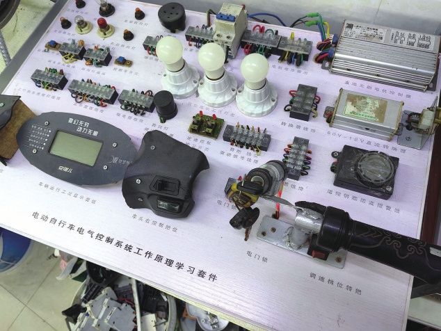 夏志祥向记者展示了其中一个电动自行车电气控制系统工作原理学习套件:电机控制器、转换器、转把、灯组等所有电气部件都被集成在一块大面板上,线路走向清清楚楚。“我保留了车把和按钮,转动把手能看到电机转速变化,按钮转向灯会亮、喇叭会响,非常形象。”
