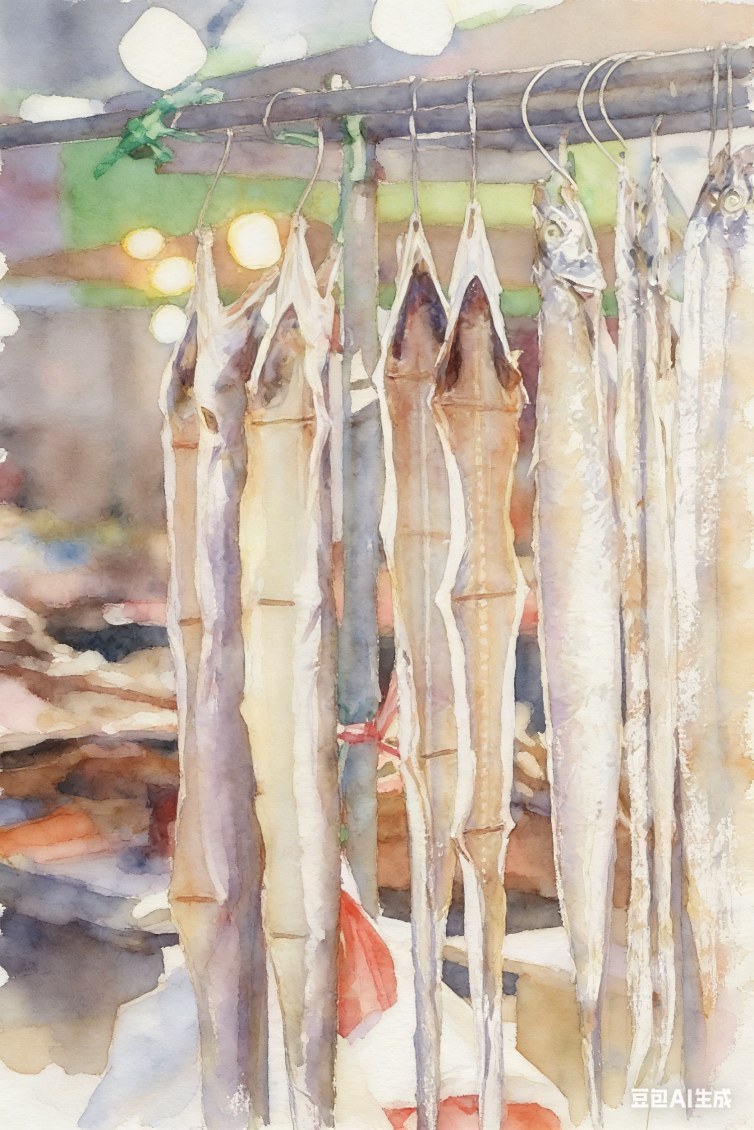 老爷子已经把竹制的晒架支棱起来,又拿出提前准备好的细铁丝。洗剖干净的鱼货被一一串起,小鱿鱼一个个垂挂着,透着新鲜的粉白色。