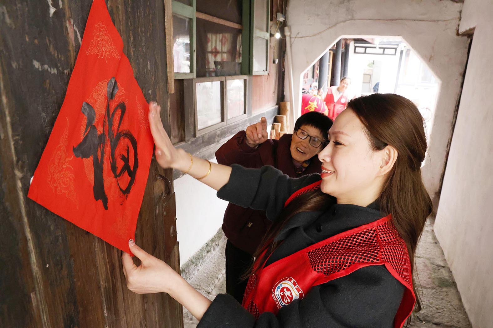 近日,定海区东管庙社区组织多名志愿者,来到辖区老人家中,为他们挂灯笼、贴福字并送上新春祝福,让大家在喜庆的氛围中迎接春节的到来。