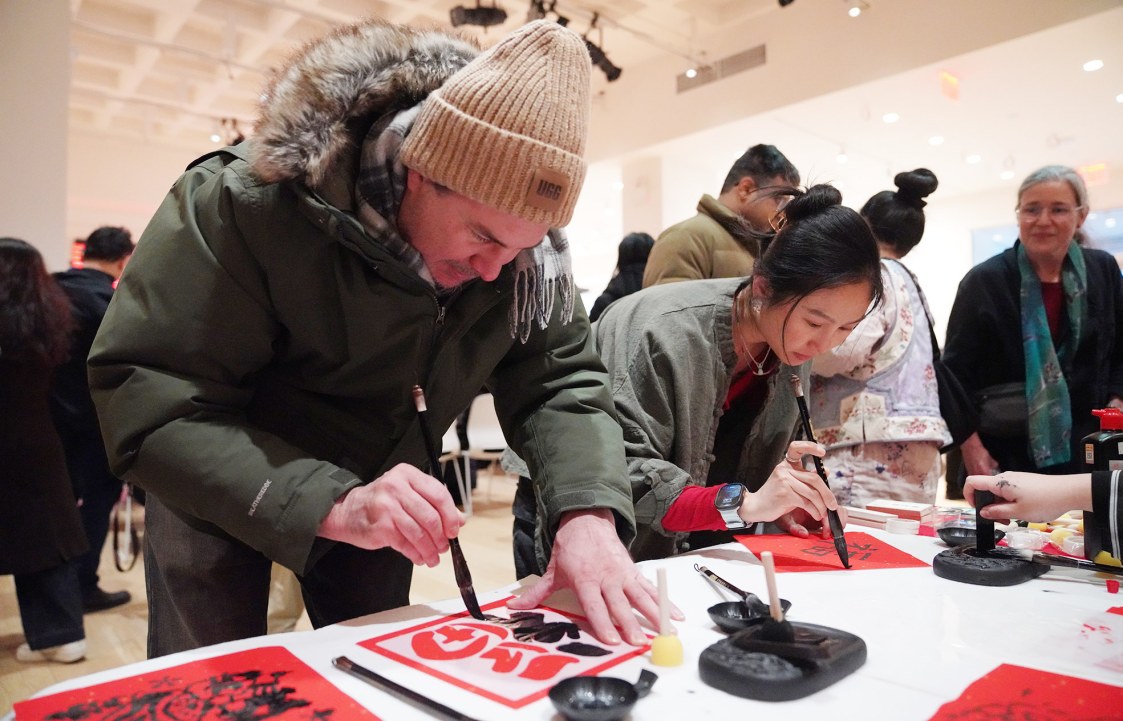 2月8日,在美国纽约举行的“中国味道”春节文化活动上,人们体验中国书法。