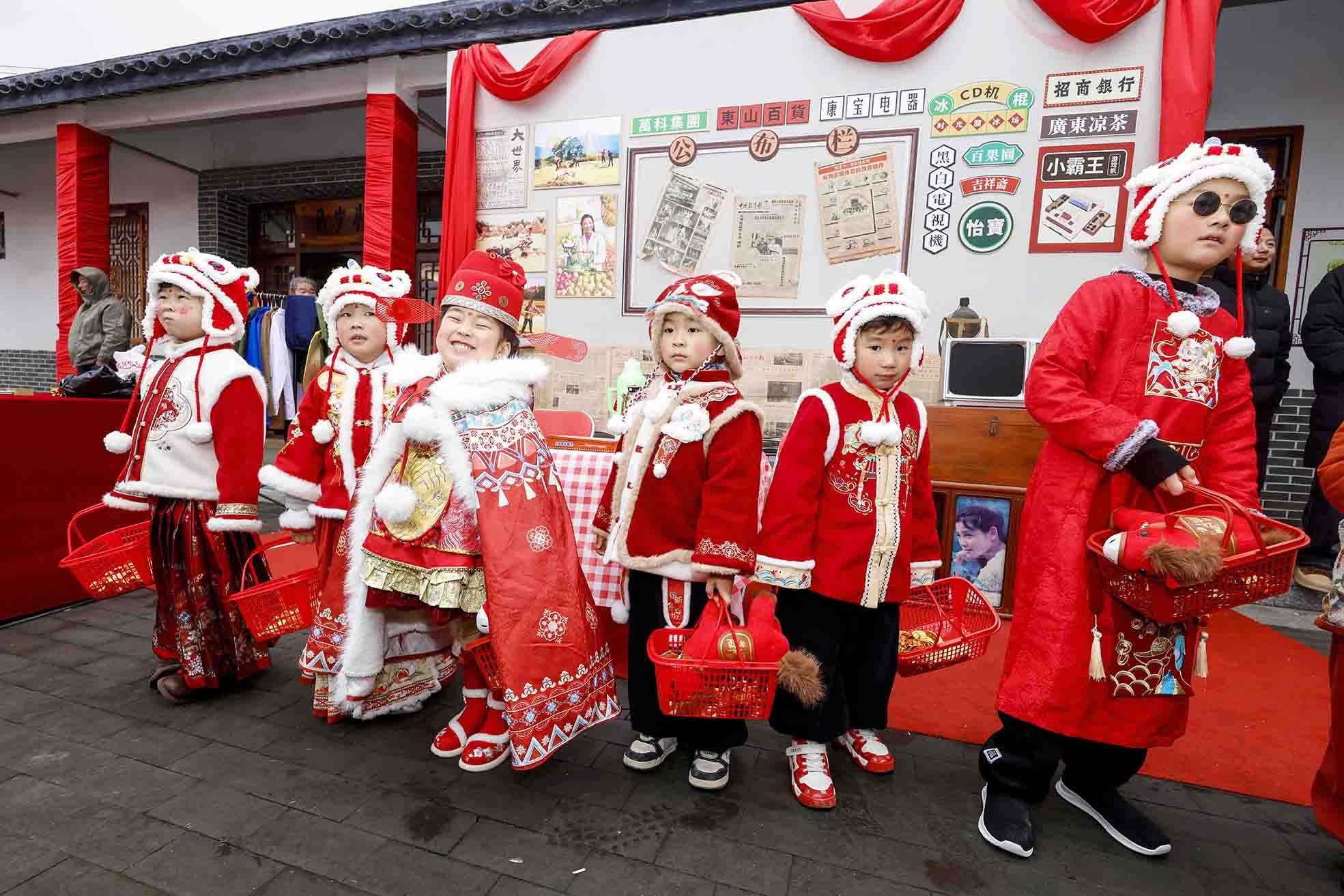 2月7日,在普陀区东港街道塘头村举行的迎新春活动上,小朋友穿着一新,十分喜气