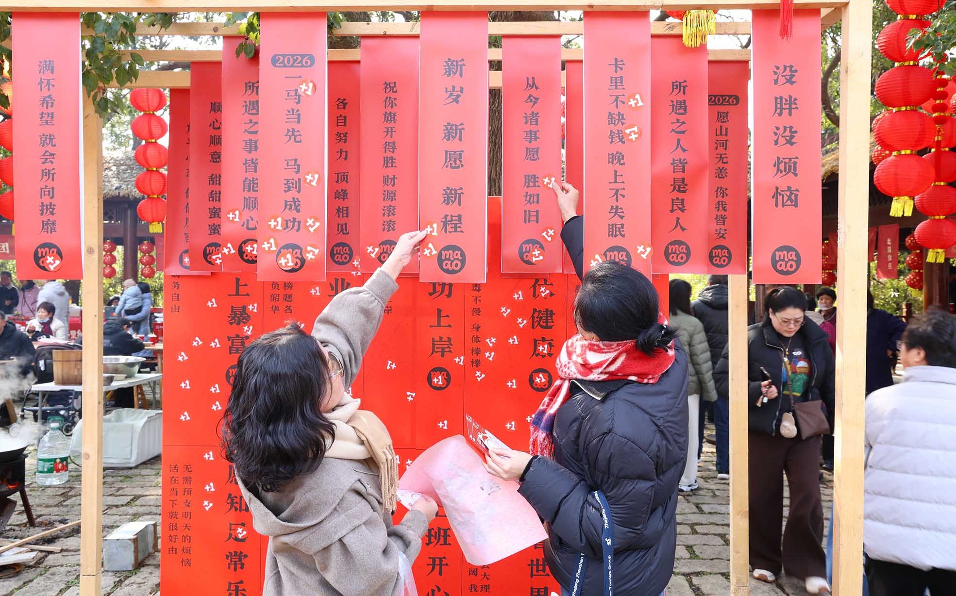 2月1日,以“岙里乡约·我们的村集”为主题的2026千年马岙年货集活动在定海区马岙文廊集市举行,图为两名游客在许愿墙贴上许愿分