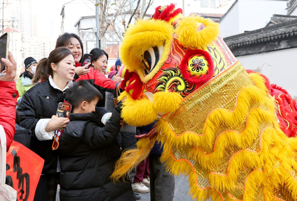 2月12日,游客在上海春联大会上与舞狮互动。