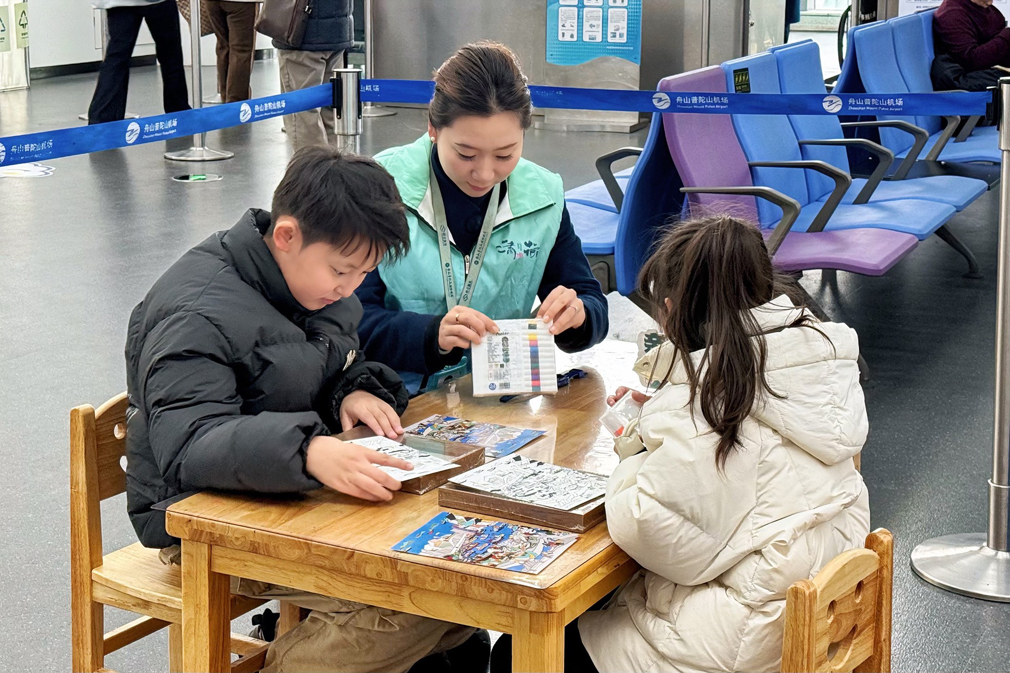 本报讯 2月12日上午,普陀山国际机场祥云文化廊内暖意浓浓,五六名戴着“无陪儿童”标识牌的孩子围坐在长桌前,认真给渔网、浪花和大黄鱼的线稿上色,叽叽喳喳的笑声,让候机不再枯燥。