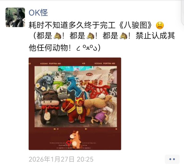 近日,网友“OK怪”在朋友圈发了自己钩织的8匹小马的照片,并取名《八骏图》,引发了朋友们的热议。