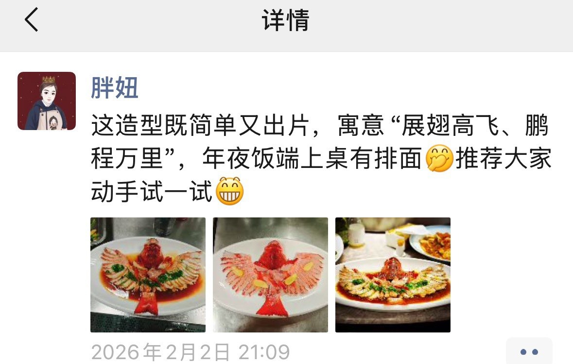 “这道菜让年味和排面一步到位。”胖妞将成品分享至朋友圈,引来众多点赞。这道造型大气、寓意吉祥的菜肴,在新年来临之际,既适合家庭团圆宴,也可作为款待亲友的精致年菜,为新春餐桌增添了一份鲜美的仪式感。