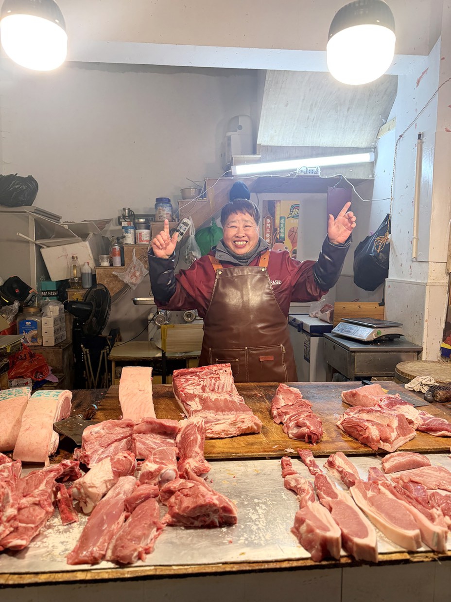 “人这一辈子,啥都不如身体好,平安健康,就是最大的福气。”谈及第一个心愿,方珍女的话语实在又恳切,眉眼间满是真诚。今年57岁的她,在肉摊前一站就是26年,常年搬卸猪肉、分割肉块,日复一日的繁重劳作,让她的腰和手时常传来酸痛,尤其是天冷的时候,疼痛感会愈发明显,但她从未抱怨过一句,总是笑着说“习惯了”。