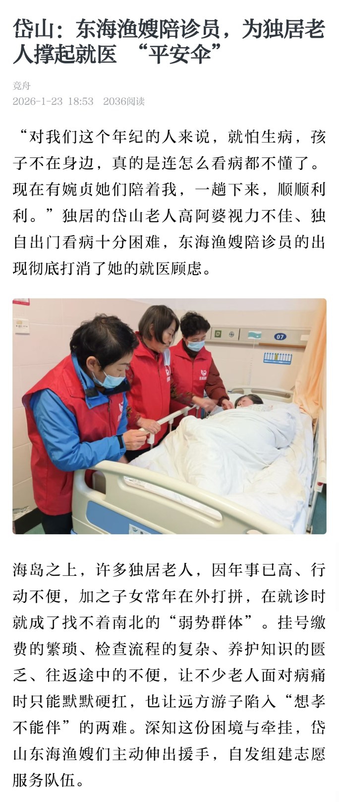 近年来,随着我市人口老龄化程度日益加深,如何让老年群体更方便地就医成为全社会关注的焦点。尤其是对一些孤寡老人、失独老人而言,“就医难”更是不容忽视的问题。此次岱山阳光敬老志愿服务站推出“爱心护航·温暖就医”行动,由“患者跑”变为“陪诊跑”,不仅能省去老年患者很多时间与精力,有效缓解老年人“就医难”问题,让老年人在就医过程中感受到了前所未有的关爱与温暖,在精神上给予了莫大慰藉。