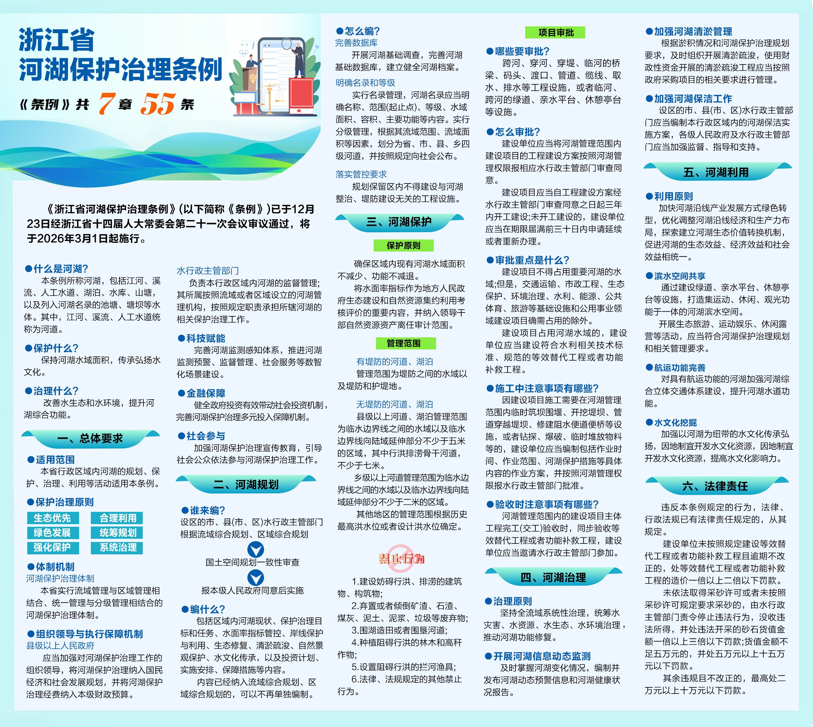 《条例》共七章五十五条,围绕建设“水安人聚、水秀景美、水活业兴、水润民富”的幸福河湖目标,构建形成了集河湖规划、保护、治理、利用于一体的全链条体系,核心聚焦四方面重点: