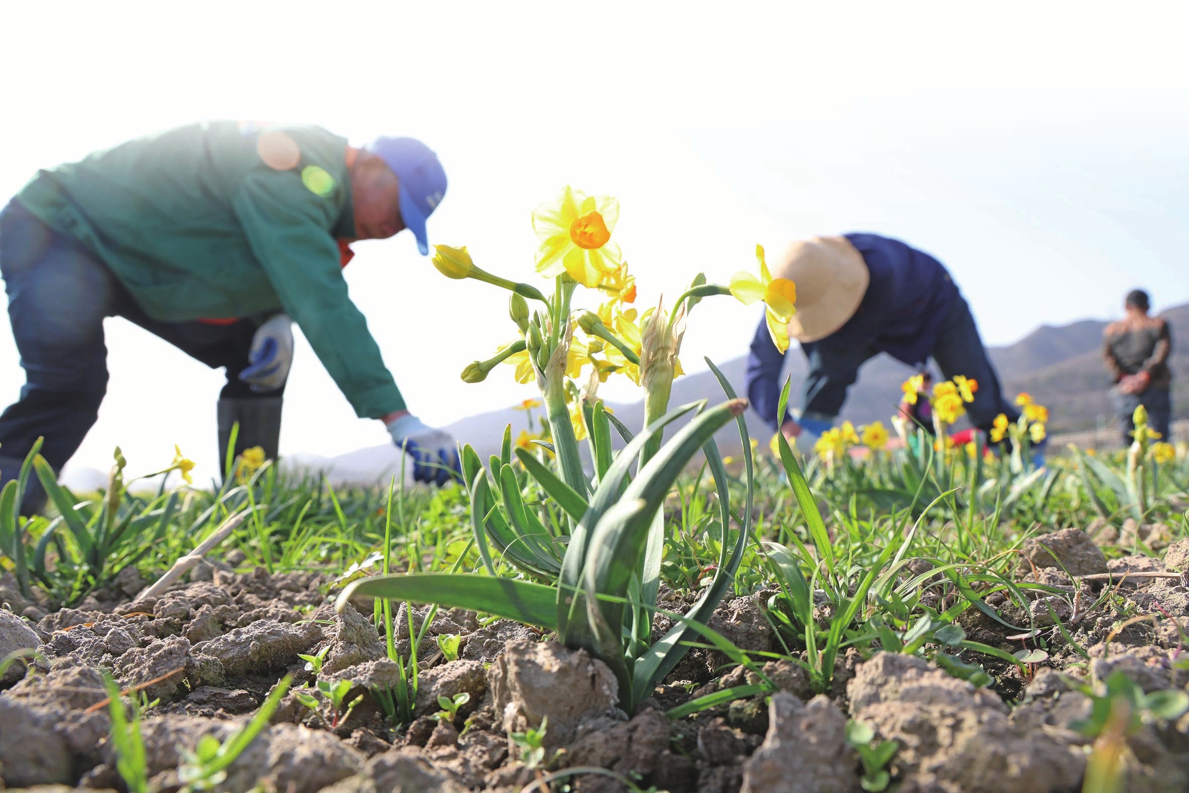 2月23日,早春时节,在普陀田园综合体内,农民们抢抓农时,为种植的5亩普陀水仙进行修花处理,促进其更好生长