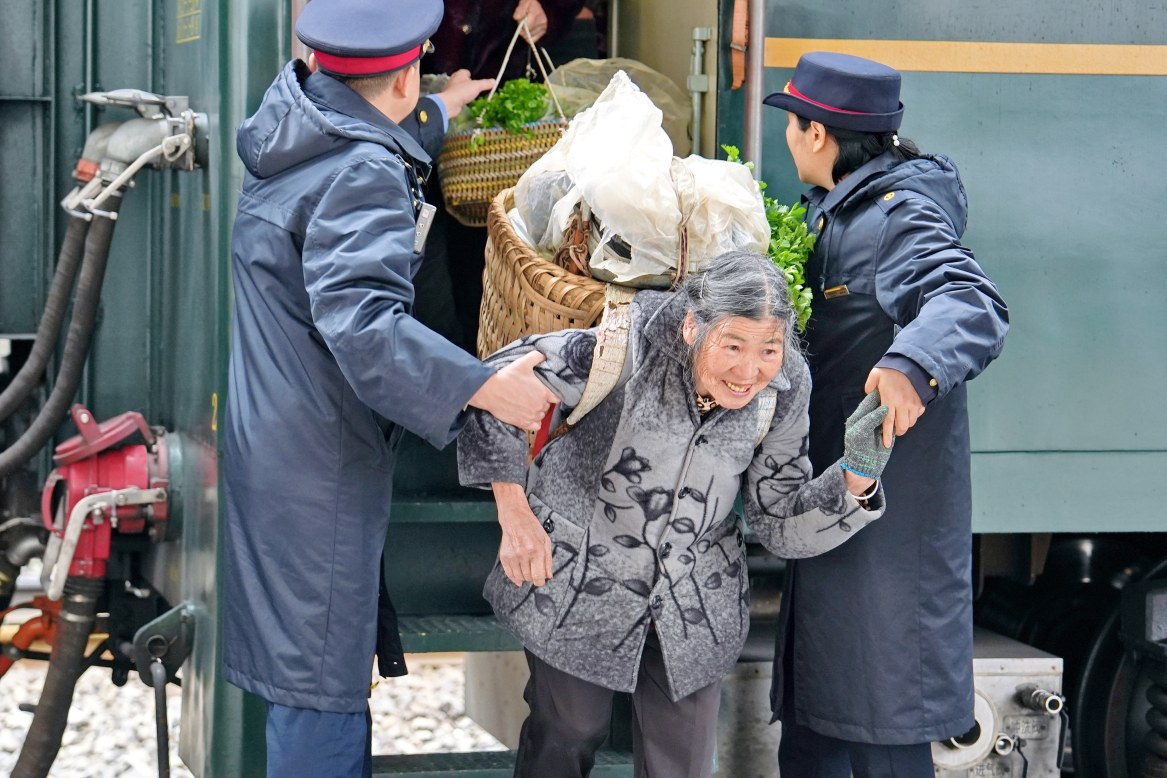 2月25日,在遵义市,5630次列车到达桐梓站后,铁路工作人员协助村民下车。
