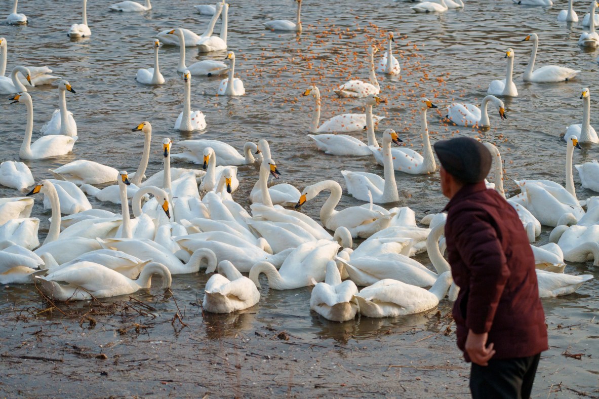 2月25日,工作人员在辽宁省大凌河朝阳市北票市河段投喂天鹅。冬季以来,大批天鹅飞临大凌河栖息越冬,吸引人们前来观赏和拍照。
