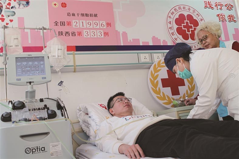 志愿者正在为配型成功的白血病患者捐献造血干细胞