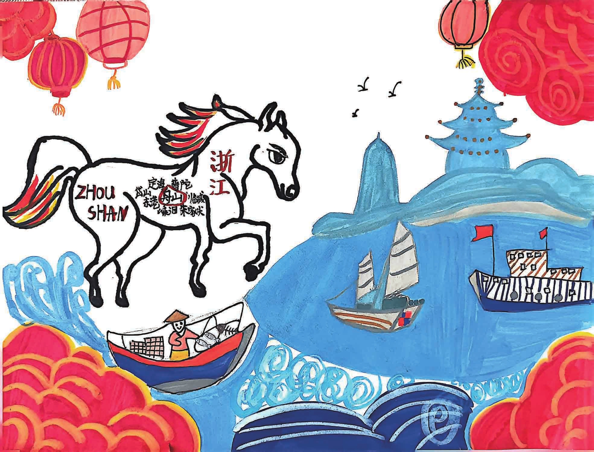 奔腾红马踏浪而来,马腹间巧绘舟山各区县轮廓,象征全域同心。搭配渔船、建筑等元素,灯笼映波,鱼虾满舱,既显山海壮阔,又寄寓马年舟山海晏河清、各区共富、万家安康的美好愿景。