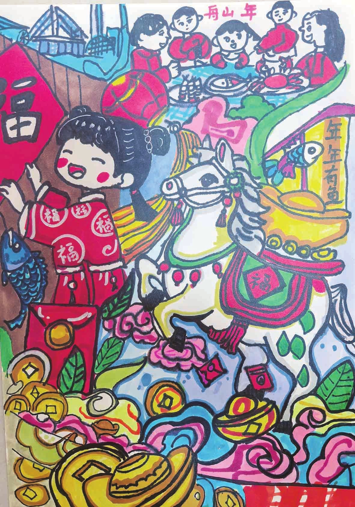 这幅舟山渔民画以马年为核心,白马驮福、金鳞跃波,搭配满盘元宝与团圆人群,既融入“马到成功”“年年有余”的吉祥寓意,又展现了舟山渔家阖家团圆、喜迎新春的热闹盛景,满是山海间的淳朴年味。