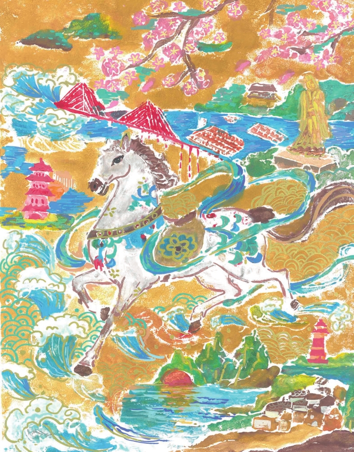 我用多色板画的方式,多次上色拓印,最后用马克笔勾勒轮廓。骏马置于山海之间,有马到成功、奋发向前的寓意。桃花岛、贻贝养殖场、状元阁、灯塔、沙雕等元素,用海浪串联全域,即展现舟山风光,又寄托新春吉祥。