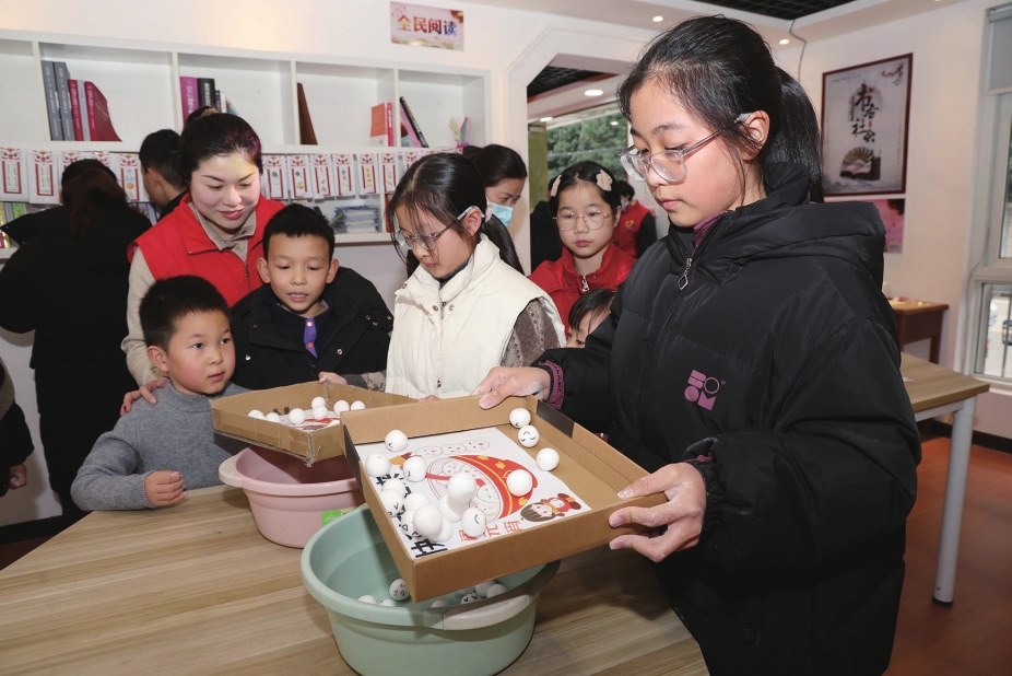 3月2日,定海区西管庙社区“亲子同乐庆元宵”活动举行,图为社区居民参与“滚到碗里来”互动游戏